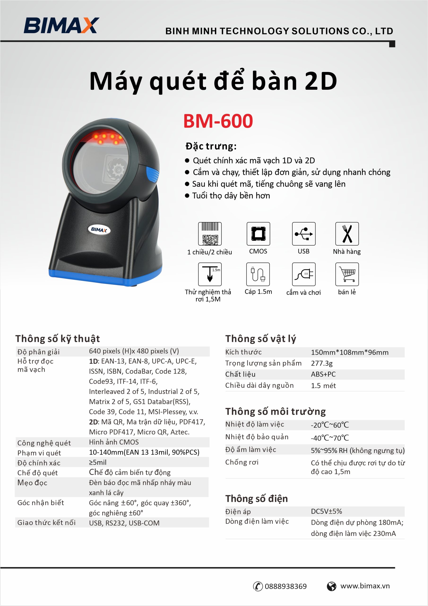 • Máy quét mã vạch 2D Bimax BM-600 Máy quét mã vạch 2D Bimax BM-600